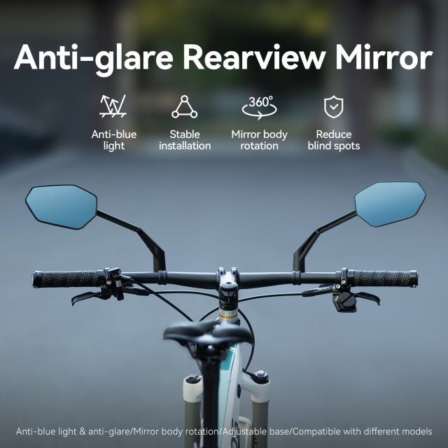 This rearview mirror features a round, anti-glare lens with anti-blue light protection, reducing harsh reflections and eye strain in bright sunlight or low-angle lighting. The adjustable base allows you to fine-tune the angle for your perfect view, while the full 360° rotation ensures maximum flexibility for different riding positions and bike setups.